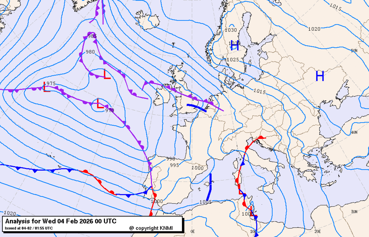 Op dinsdag 3 februari liggen er een hogedrukgebied boven Scandinavië en meerdere lagedrukgebieden boven de Atlantische Oceaan. In het noorden van het land is hierdoor een oostelijke stroming die koude lucht aanvoert. In de rest van het land is de stroming zuidelijk en is het beduidend zachter (figuur 1). Een occlusie (de paarse lijn in figuur 2) trekt in de nacht naar woensdag en woensdagochtend noordwaarts over het land (figuur 3). Op deze scheidslijn van warme en koude lucht ontstaat ijzel. De occlusie met de ijzel verlaat aan het einde van woensdagochtend het land, maar het duurt nog enige tijd voordat de ijzel op de straten is weggesmolten en de gladheid is verdwenen.