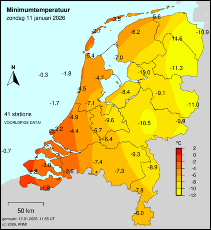 Op zondag 11 januari kwam het KNMI Expertteam bijeen om de weersituatie te bespreken. Ook werden andere weerbureaus bevraagd over hun inschatting van de gladheid. Om 12:00 uur heeft het KNMI code oranje uitgegeven voor het hele land, met uitzondering van de provincies Zeeland en Zuid-Holland: