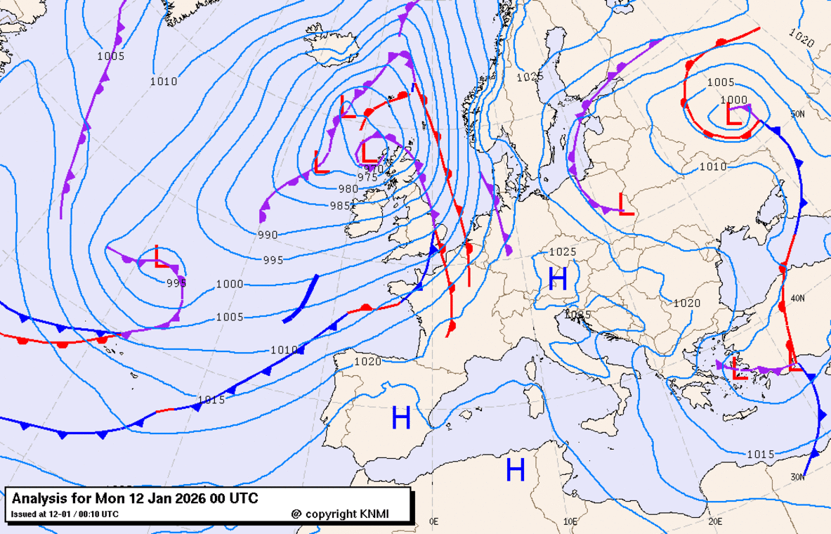 11 januari bevindt zich zeer koude lucht in Nederland, met name in het oosten van het land (figuur 1). Een lagedrukgebied boven de Atlantische Oceaan trekt richting Schotland op zondag. Het warmtefront (rode lijn in figuur 2) dat bij dit lagedrukgebied hoort, bereikt Nederland zondagavond, gevolgd door een occlusie (paarse lijn boven Engeland in figuur 2). De neerslag van het warmtefront bereikt in de tweede helft van de avond het uiterste zuidwesten en trekt in de loop van de nacht en ochtend verder oostwaarts over het land. In het westen valt er vooral regen, verder landinwaarts meer ijzel en (natte) sneeuw. De regen valt op veel plekken op een bevroren wegdek. Ook is het op sommige plekken onderkoelde regen die bevriest wanneer het de grond raakt. Daarom zorgt het front op veel plekken voor gevaarlijke gladheid.