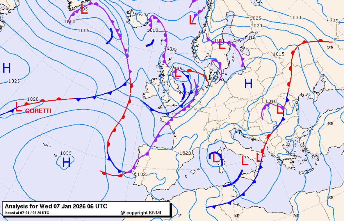 Een lagedrukgebied trekt op 7 januari vanaf Schotland geleidelijk zuidoostwaarts. Het bijbehorende koufront bereikt de Nederlandse kust aan het einde van de nacht en trekt in de ochtend en middag oostwaarts over Nederland. Het koufront zorgt voor veel sneeuw. Daarnaast zorgt het lagedrukgebied ook voor veel wind, waardoor het zicht plaatselijk slecht is en de sneeuw kan opwaaien tot sneeuwduinen. Ook na het koufront trekken er nog enkele sneeuwbuien over.