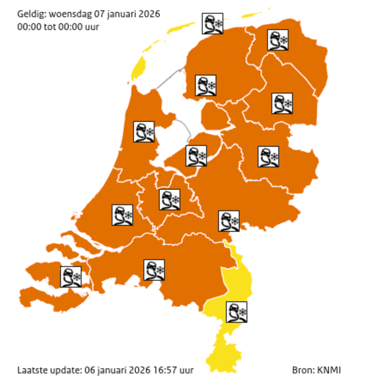 “De sneeuwzone begint woensdagochtend in het westen en breidt zich uit naar het oosten. In een brede kuststrook blijft er naar verwachting weinig sneeuw liggen en is de kans op gladheid minder groot. Verder landinwaarts verwachten we 3-5 cm, plaatselijk 5-7 cm. Code oranje geldt in het hele land, met uitzondering van Limburg en de Wadden. Daar blijft code geel van kracht voor gladheid.”