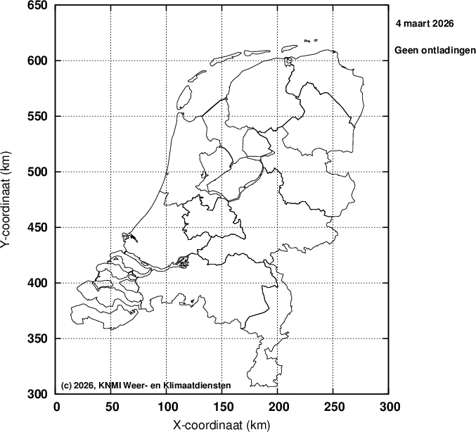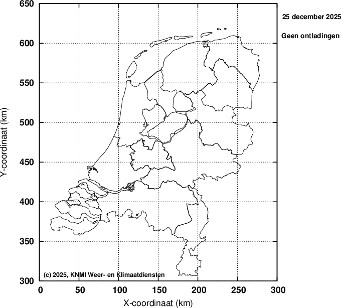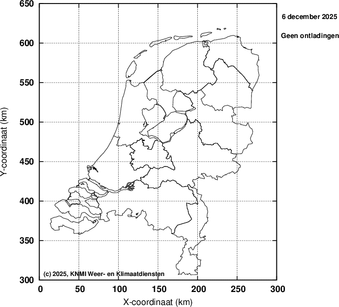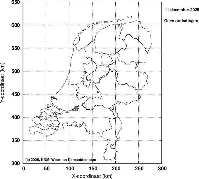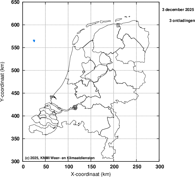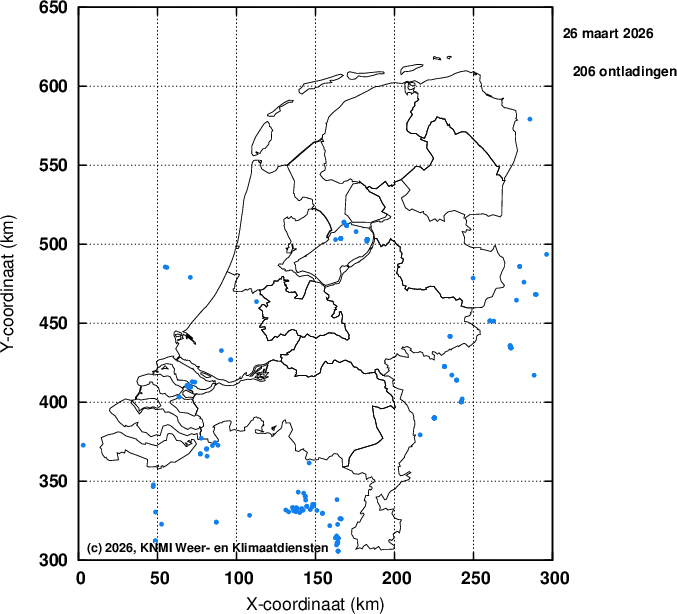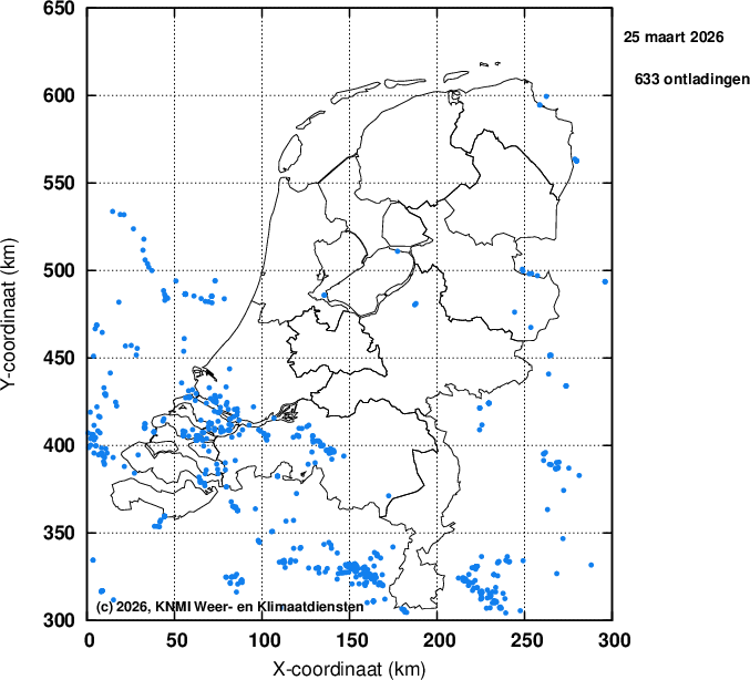 Ieder bolletje staat voor een gedetecteerde ontlading. Er wordt geen onderscheid gemaakt tussen horizontale (wolk-wolk) en verticale (wolk-aarde) ontladingen.