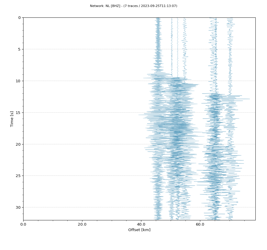Op de horizontale as is de afstand in km weergegeven en op de vertikale as de tijd in seconden ten opzichte van de tijd van de beving. De data die getoond wordt is gefilterd met een Butterworth filter tussen 2 en 20 Hz. De stations zijn niet op dezelfde manier geschaald.