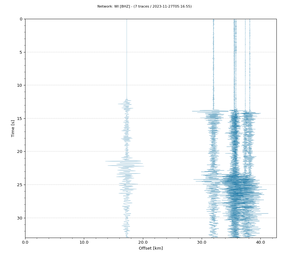 Op de horizontale as is de afstand in km weergegeven en op de vertikale as de tijd in seconden ten opzichte van de tijd van de beving. De data die getoond wordt is gefilterd met een Butterworth filter tussen 2 en 20 Hz. De stations zijn niet op dezelfde manier geschaald.