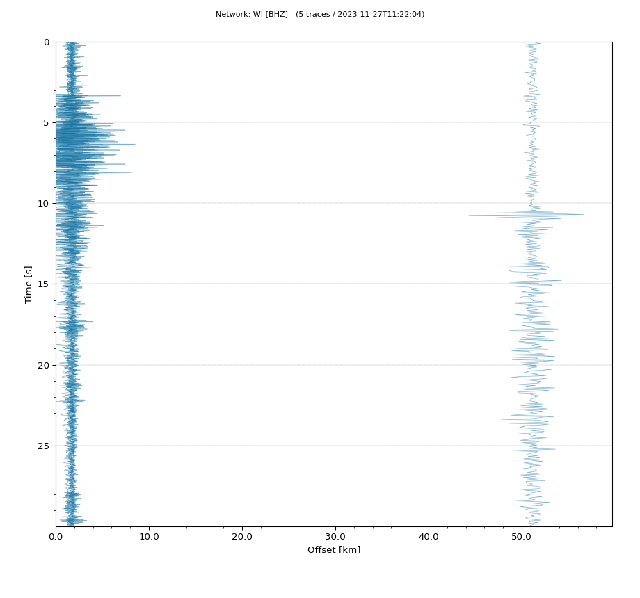Op de horizontale as is de afstand in km weergegeven en op de vertikale as de tijd in seconden ten opzichte van de tijd van de beving. De data die getoond wordt is gefilterd met een Butterworth filter tussen 2 en 20 Hz. De stations zijn niet op dezelfde manier geschaald.