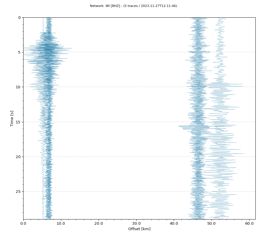 Op de horizontale as is de afstand in km weergegeven en op de vertikale as de tijd in seconden ten opzichte van de tijd van de beving. De data die getoond wordt is gefilterd met een Butterworth filter tussen 2 en 20 Hz. De stations zijn niet op dezelfde manier geschaald.
