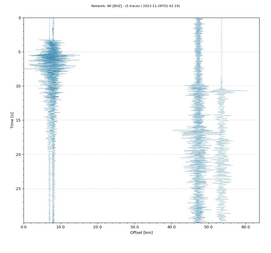 Op de horizontale as is de afstand in km weergegeven en op de vertikale as de tijd in seconden ten opzichte van de tijd van de beving. De data die getoond wordt is gefilterd met een Butterworth filter tussen 2 en 20 Hz. De stations zijn niet op dezelfde manier geschaald.