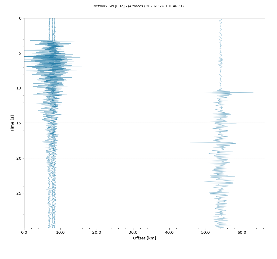 Op de horizontale as is de afstand in km weergegeven en op de vertikale as de tijd in seconden ten opzichte van de tijd van de beving. De data die getoond wordt is gefilterd met een Butterworth filter tussen 2 en 20 Hz. De stations zijn niet op dezelfde manier geschaald.