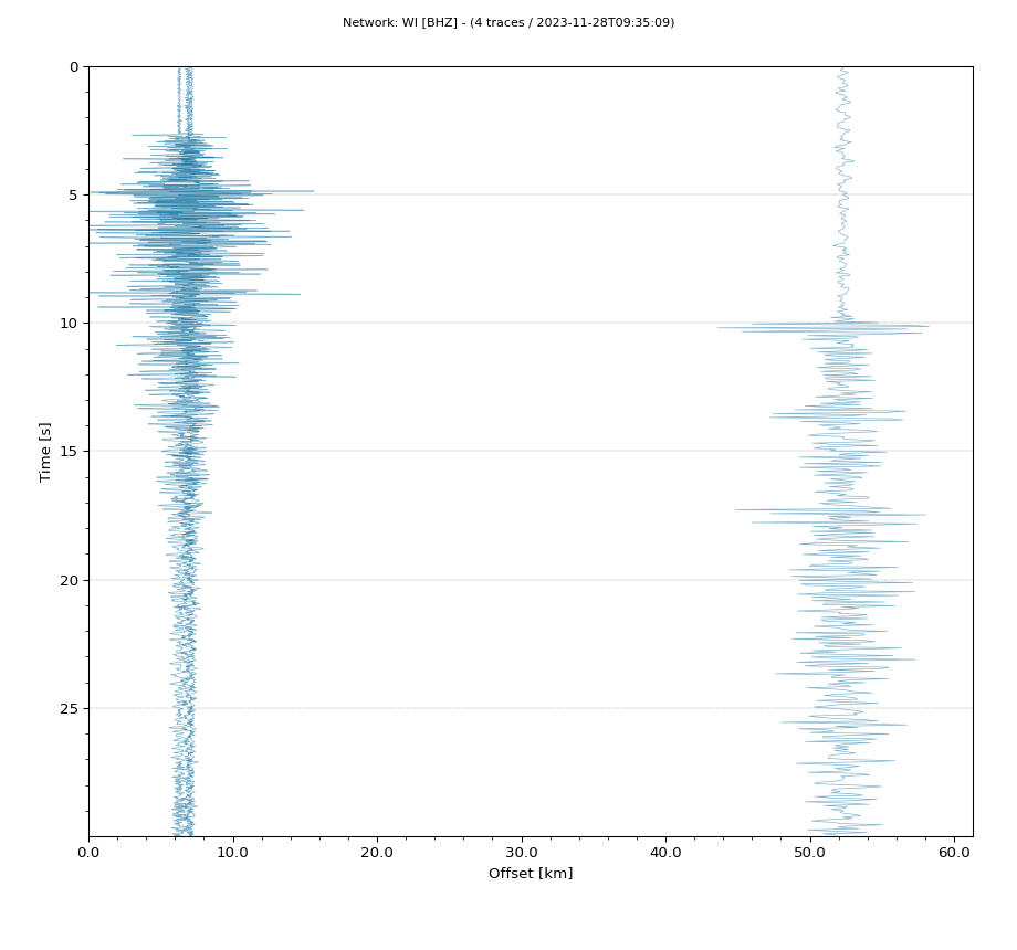 Op de horizontale as is de afstand in km weergegeven en op de vertikale as de tijd in seconden ten opzichte van de tijd van de beving. De data die getoond wordt is gefilterd met een Butterworth filter tussen 2 en 20 Hz. De stations zijn niet op dezelfde manier geschaald.
