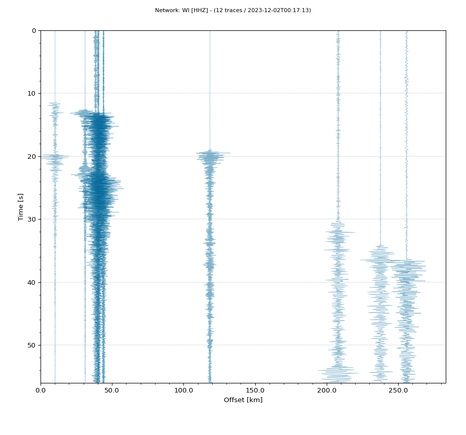 Op de horizontale as is de afstand in km weergegeven en op de vertikale as de tijd in seconden ten opzichte van de tijd van de beving. De data die getoond wordt is gefilterd met een Butterworth filter tussen 2 en 20 Hz. De stations zijn niet op dezelfde manier geschaald.