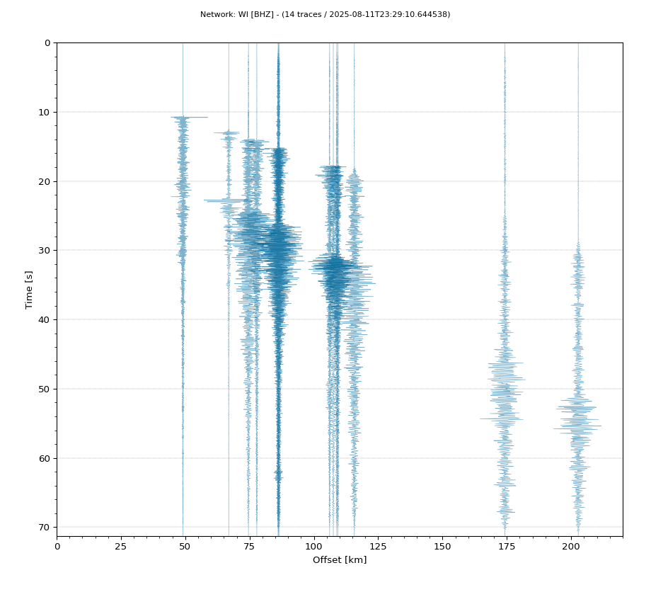 Op de horizontale as is de afstand in km weergegeven en op de vertikale as de tijd in seconden ten opzichte van de tijd van de beving. De data die getoond wordt is gefilterd met een Butterworth filter tussen 2 en 20 Hz. De stations zijn niet op dezelfde manier geschaald.