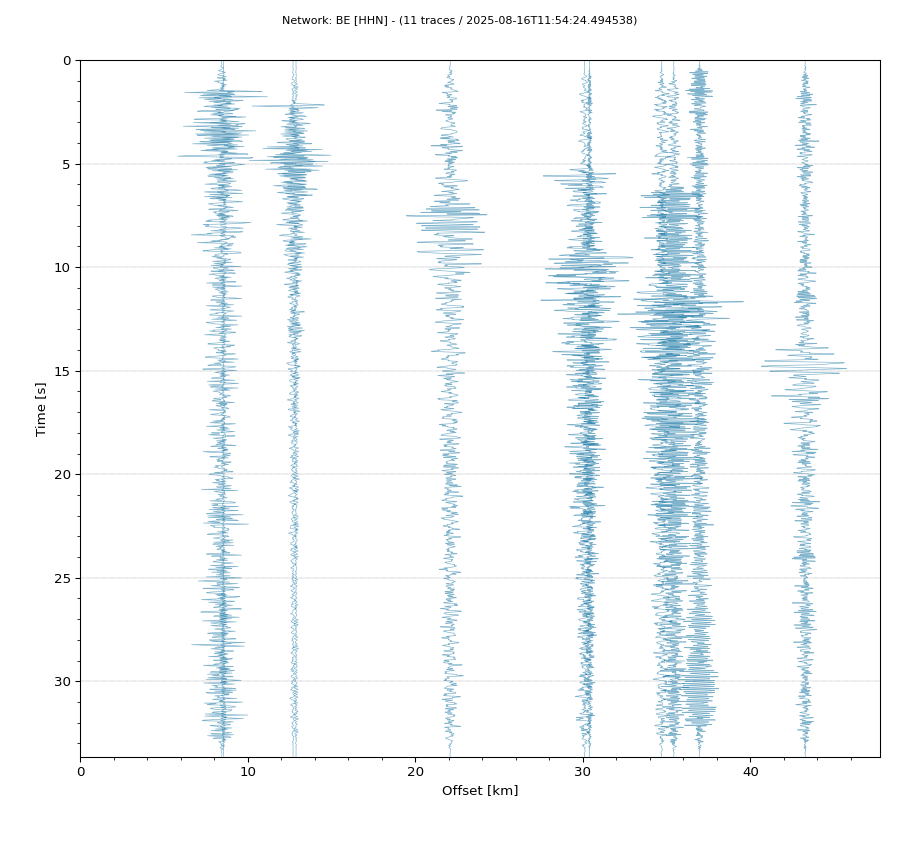 Op de horizontale as is de afstand in km weergegeven en op de vertikale as de tijd in seconden ten opzichte van de tijd van de beving. De data die getoond wordt is gefilterd met een Butterworth filter tussen 2 en 20 Hz. De stations zijn niet op dezelfde manier geschaald.