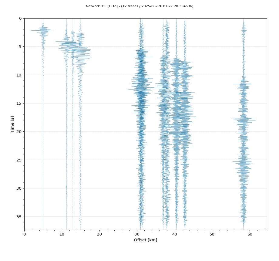 Op de horizontale as is de afstand in km weergegeven en op de vertikale as de tijd in seconden ten opzichte van de tijd van de beving. De data die getoond wordt is gefilterd met een Butterworth filter tussen 2 en 20 Hz. De stations zijn niet op dezelfde manier geschaald.