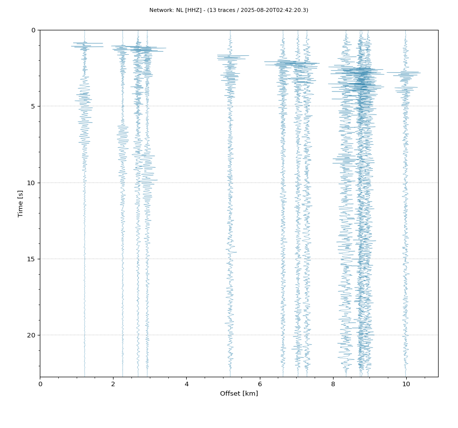 Op de horizontale as is de afstand in km weergegeven en op de vertikale as de tijd in seconden ten opzichte van de tijd van de beving. De data die getoond wordt is gefilterd met een Butterworth filter tussen 2 en 20 Hz. De stations zijn niet op dezelfde manier geschaald.