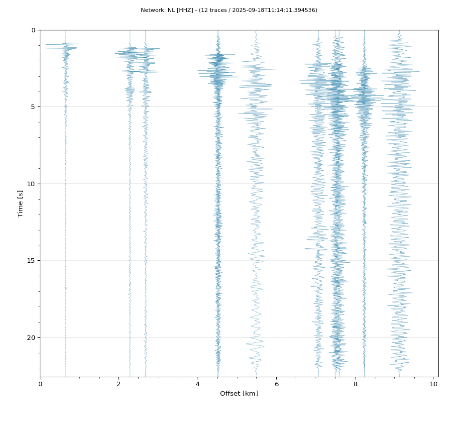 Op de horizontale as is de afstand in km weergegeven en op de vertikale as de tijd in seconden ten opzichte van de tijd van de beving. De data die getoond wordt is gefilterd met een Butterworth filter tussen 2 en 20 Hz. De stations zijn niet op dezelfde manier geschaald.