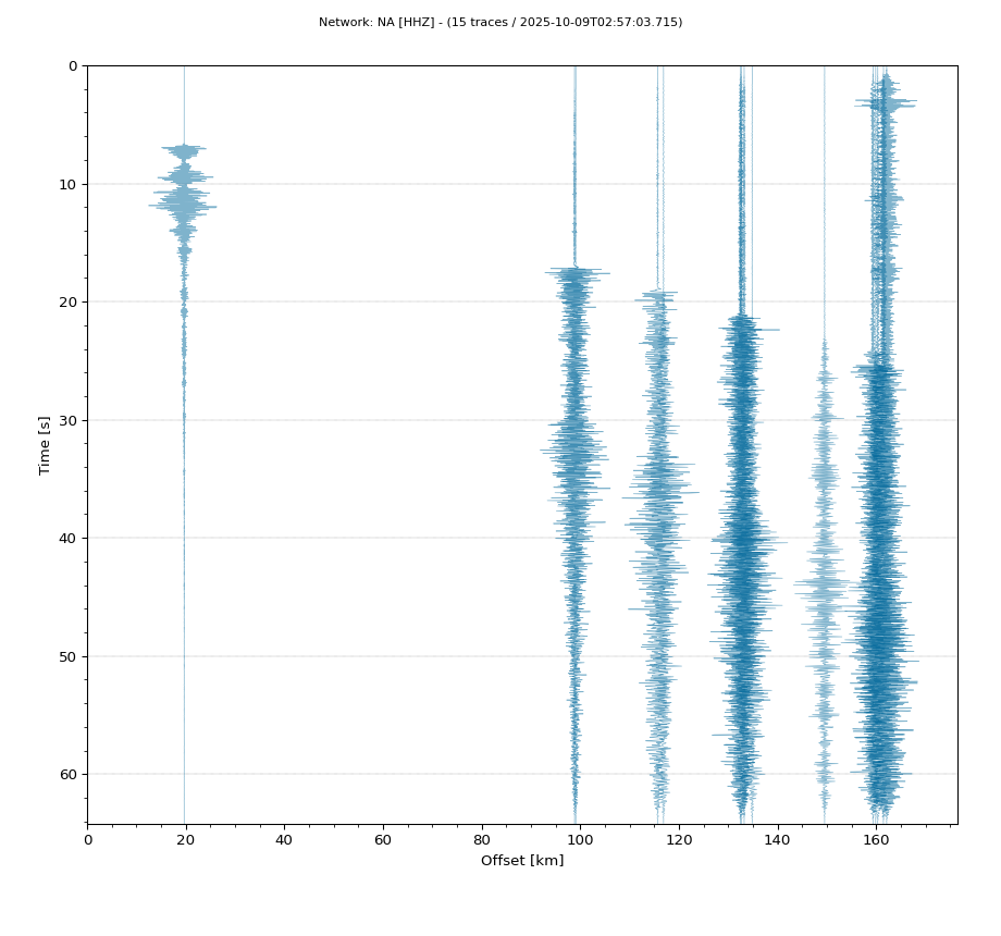 Op de horizontale as is de afstand in km weergegeven en op de vertikale as de tijd in seconden ten opzichte van de tijd van de beving. De data die getoond wordt is gefilterd met een Butterworth filter tussen 2 en 20 Hz. De stations zijn niet op dezelfde manier geschaald.