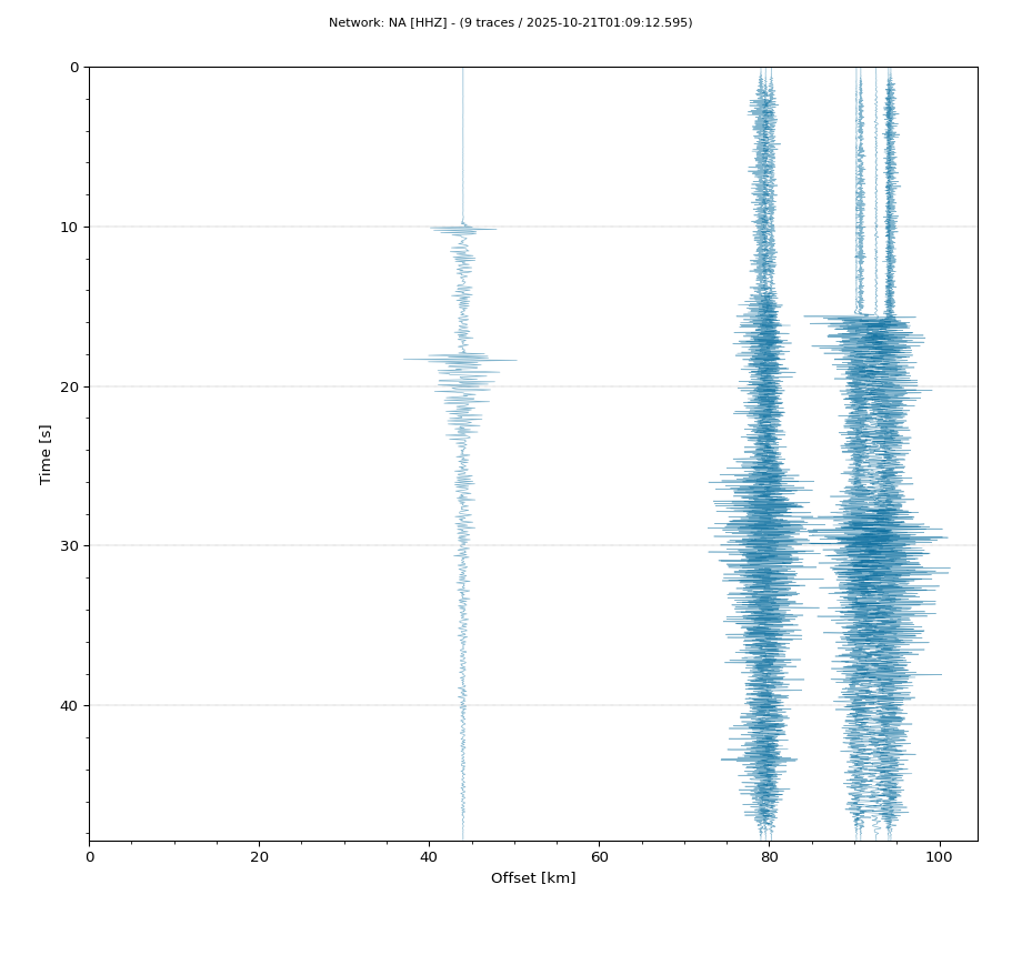 Op de horizontale as is de afstand in km weergegeven en op de vertikale as de tijd in seconden ten opzichte van de tijd van de beving. De data die getoond wordt is gefilterd met een Butterworth filter tussen 2 en 20 Hz. De stations zijn niet op dezelfde manier geschaald.