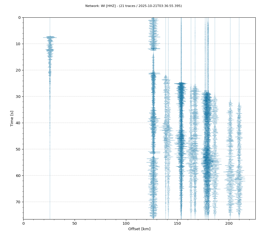 Op de horizontale as is de afstand in km weergegeven en op de vertikale as de tijd in seconden ten opzichte van de tijd van de beving. De data die getoond wordt is gefilterd met een Butterworth filter tussen 2 en 20 Hz. De stations zijn niet op dezelfde manier geschaald.