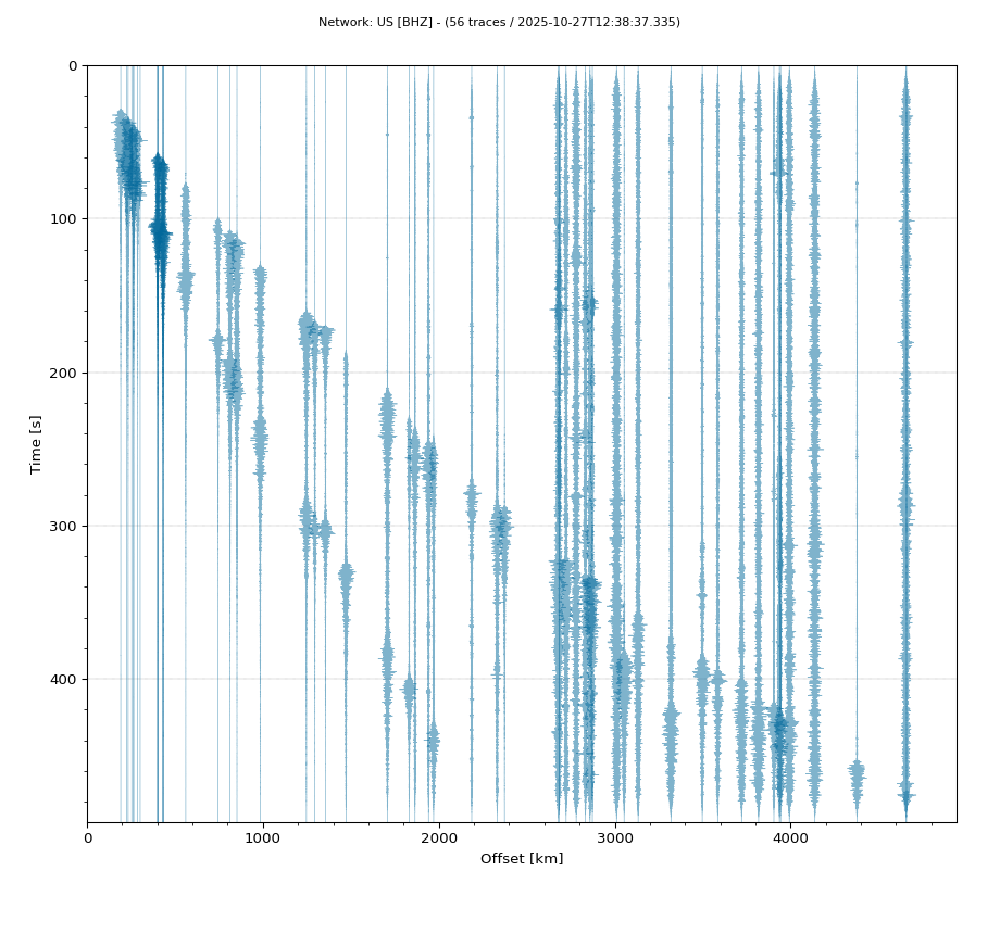 Op de horizontale as is de afstand in km weergegeven en op de vertikale as de tijd in seconden ten opzichte van de tijd van de beving. De data die getoond wordt is gefilterd met een Butterworth filter tussen 2 en 20 Hz. De stations zijn niet op dezelfde manier geschaald.