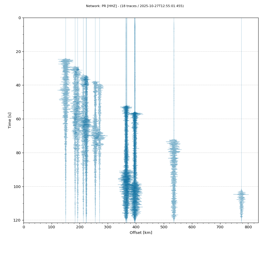 Op de horizontale as is de afstand in km weergegeven en op de vertikale as de tijd in seconden ten opzichte van de tijd van de beving. De data die getoond wordt is gefilterd met een Butterworth filter tussen 2 en 20 Hz. De stations zijn niet op dezelfde manier geschaald.