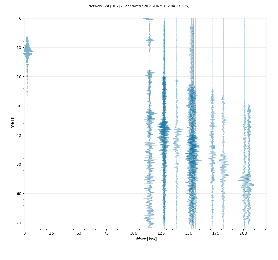 Op de horizontale as is de afstand in km weergegeven en op de vertikale as de tijd in seconden ten opzichte van de tijd van de beving. De data die getoond wordt is gefilterd met een Butterworth filter tussen 2 en 20 Hz. De stations zijn niet op dezelfde manier geschaald.
