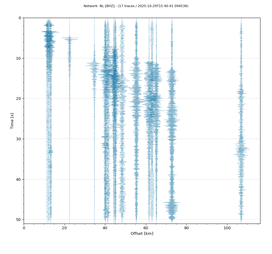 Op de horizontale as is de afstand in km weergegeven en op de vertikale as de tijd in seconden ten opzichte van de tijd van de beving. De data die getoond wordt is gefilterd met een Butterworth filter tussen 2 en 20 Hz. De stations zijn niet op dezelfde manier geschaald.