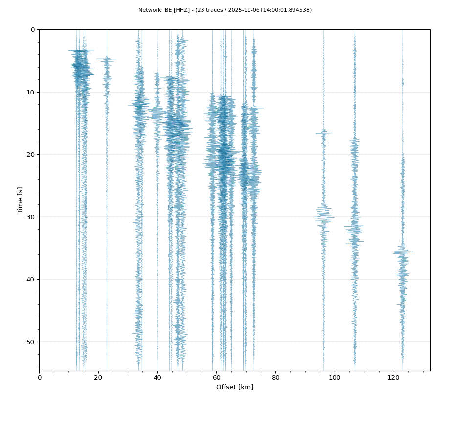 Op de horizontale as is de afstand in km weergegeven en op de vertikale as de tijd in seconden ten opzichte van de tijd van de beving. De data die getoond wordt is gefilterd met een Butterworth filter tussen 2 en 20 Hz. De stations zijn niet op dezelfde manier geschaald.