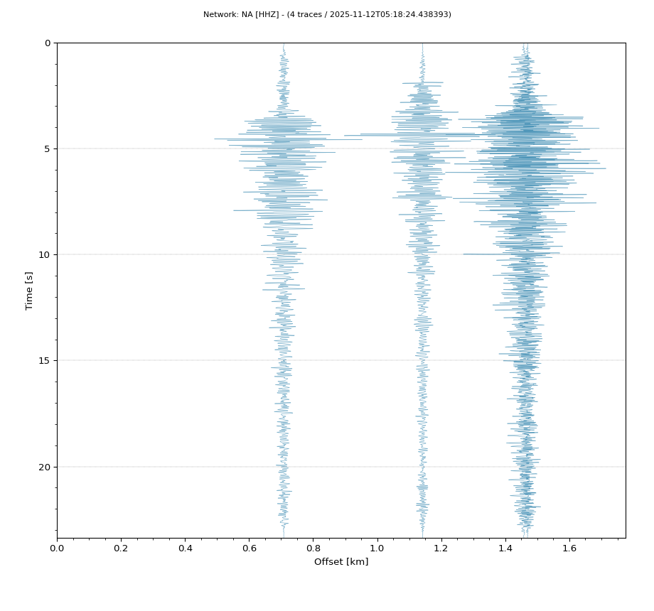Op de horizontale as is de afstand in km weergegeven en op de vertikale as de tijd in seconden ten opzichte van de tijd van de beving. De data die getoond wordt is gefilterd met een Butterworth filter tussen 2 en 20 Hz. De stations zijn niet op dezelfde manier geschaald.