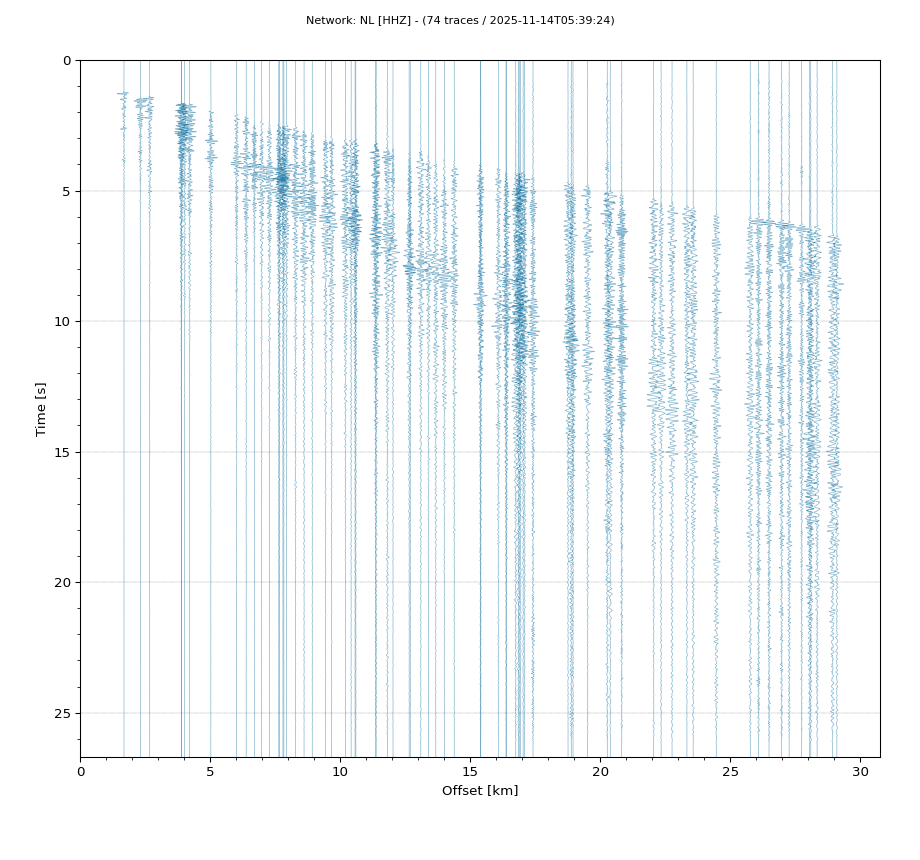 Op de horizontale as is de afstand in km weergegeven en op de vertikale as de tijd in seconden ten opzichte van de tijd van de beving. De data die getoond wordt is gefilterd met een Butterworth filter tussen 2 en 20 Hz. De stations zijn niet op dezelfde manier geschaald.