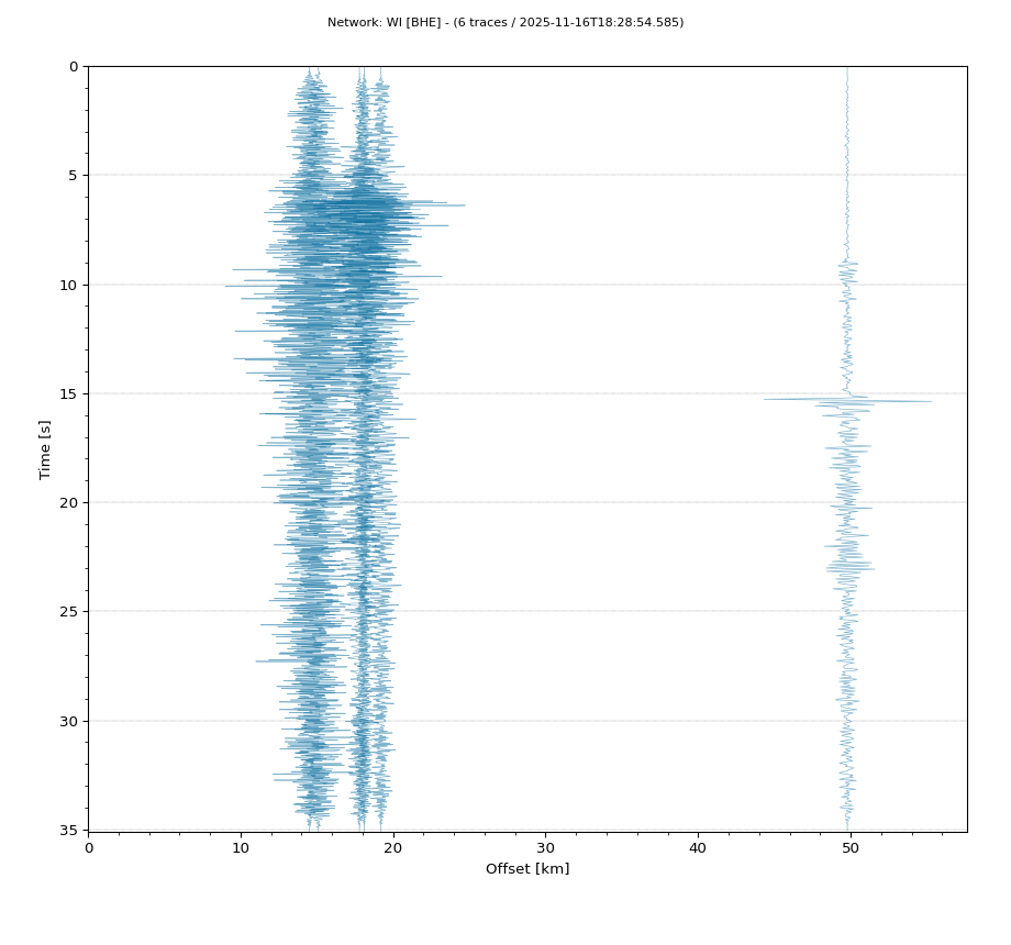 Op de horizontale as is de afstand in km weergegeven en op de vertikale as de tijd in seconden ten opzichte van de tijd van de beving. De data die getoond wordt is gefilterd met een Butterworth filter tussen 2 en 20 Hz. De stations zijn niet op dezelfde manier geschaald.