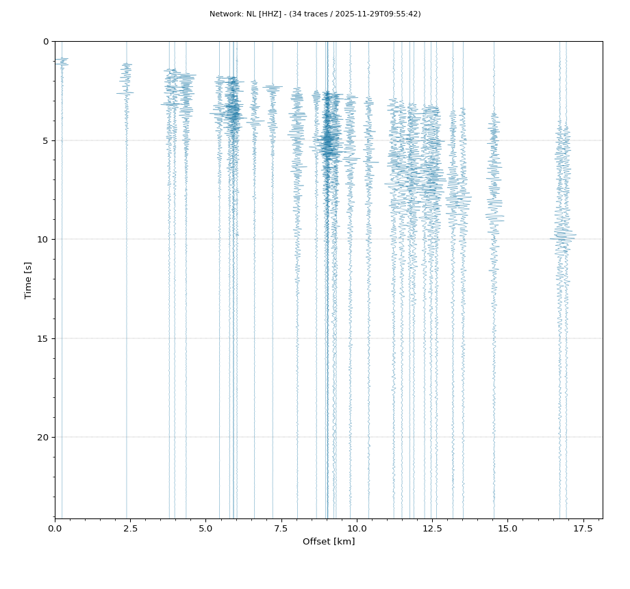 Op de horizontale as is de afstand in km weergegeven en op de vertikale as de tijd in seconden ten opzichte van de tijd van de beving. De data die getoond wordt is gefilterd met een Butterworth filter tussen 2 en 20 Hz. De stations zijn niet op dezelfde manier geschaald.