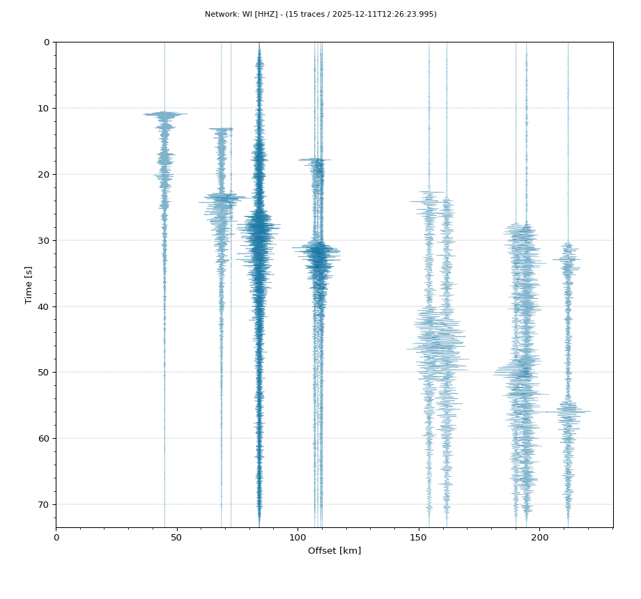 Op de horizontale as is de afstand in km weergegeven en op de vertikale as de tijd in seconden ten opzichte van de tijd van de beving. De data die getoond wordt is gefilterd met een Butterworth filter tussen 2 en 20 Hz. De stations zijn niet op dezelfde manier geschaald.