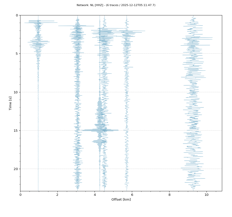 Op de horizontale as is de afstand in km weergegeven en op de vertikale as de tijd in seconden ten opzichte van de tijd van de beving. De data die getoond wordt is gefilterd met een Butterworth filter tussen 2 en 20 Hz. De stations zijn niet op dezelfde manier geschaald.