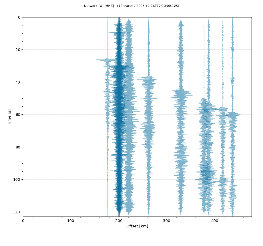 Op de horizontale as is de afstand in km weergegeven en op de vertikale as de tijd in seconden ten opzichte van de tijd van de beving. De data die getoond wordt is gefilterd met een Butterworth filter tussen 2 en 20 Hz. De stations zijn niet op dezelfde manier geschaald.