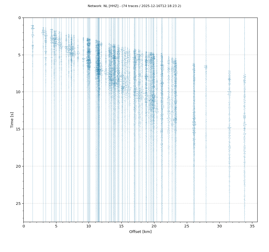 Op de horizontale as is de afstand in km weergegeven en op de vertikale as de tijd in seconden ten opzichte van de tijd van de beving. De data die getoond wordt is gefilterd met een Butterworth filter tussen 2 en 20 Hz. De stations zijn niet op dezelfde manier geschaald.