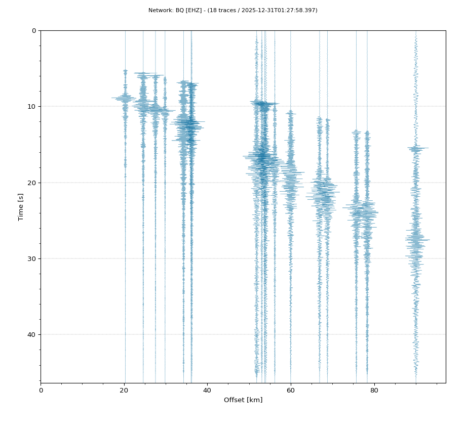 Op de horizontale as is de afstand in km weergegeven en op de vertikale as de tijd in seconden ten opzichte van de tijd van de beving. De data die getoond wordt is gefilterd met een Butterworth filter tussen 2 en 20 Hz. De stations zijn niet op dezelfde manier geschaald.