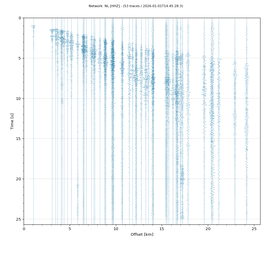 Op de horizontale as is de afstand in km weergegeven en op de vertikale as de tijd in seconden ten opzichte van de tijd van de beving. De data die getoond wordt is gefilterd met een Butterworth filter tussen 2 en 20 Hz. De stations zijn niet op dezelfde manier geschaald.