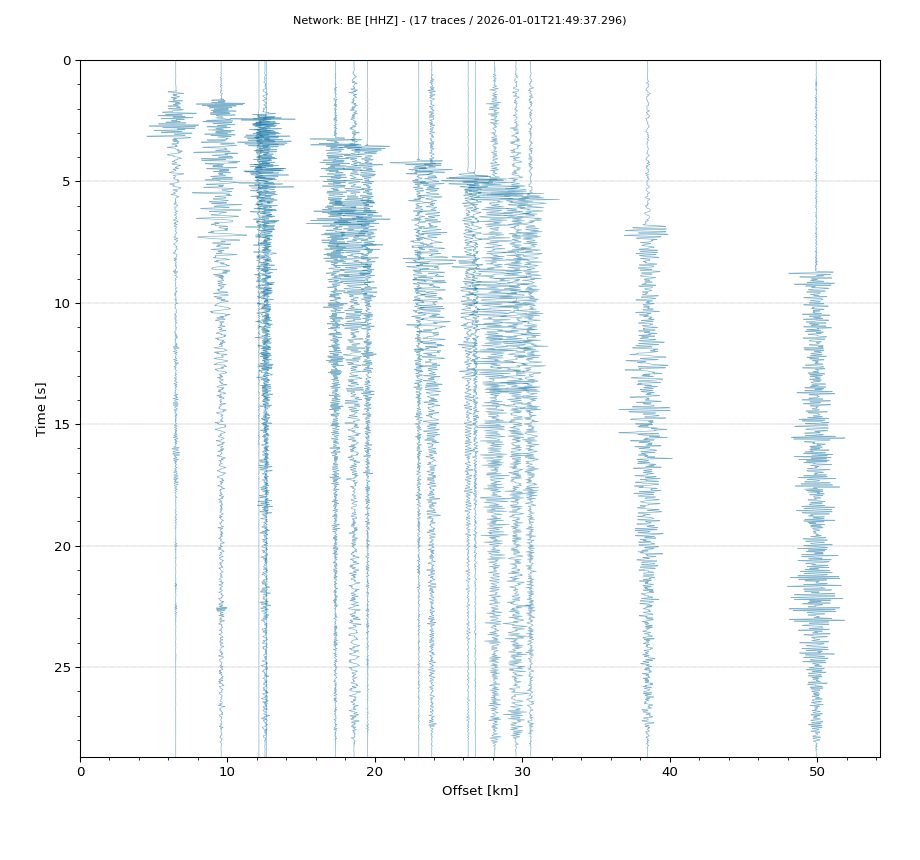 Op de horizontale as is de afstand in km weergegeven en op de vertikale as de tijd in seconden ten opzichte van de tijd van de beving. De data die getoond wordt is gefilterd met een Butterworth filter tussen 2 en 20 Hz. De stations zijn niet op dezelfde manier geschaald.
