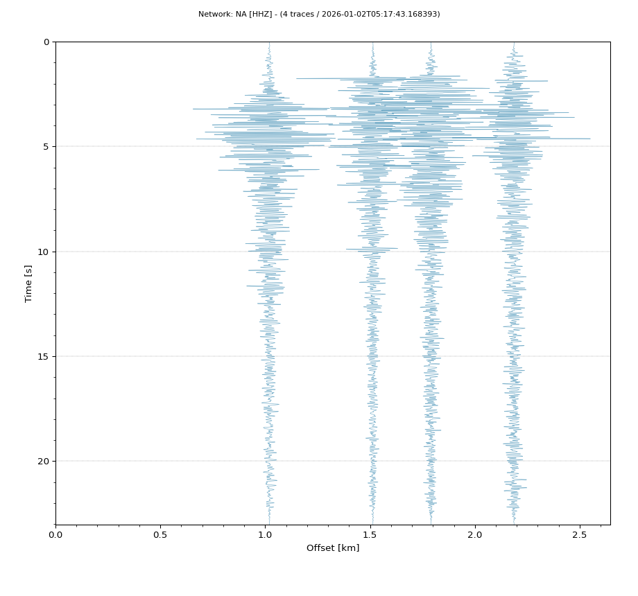 Op de horizontale as is de afstand in km weergegeven en op de vertikale as de tijd in seconden ten opzichte van de tijd van de beving. De data die getoond wordt is gefilterd met een Butterworth filter tussen 2 en 20 Hz. De stations zijn niet op dezelfde manier geschaald.