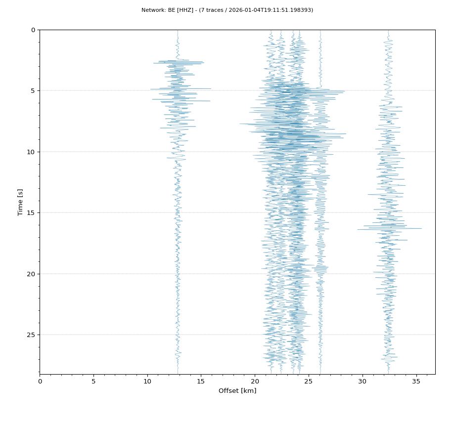 Op de horizontale as is de afstand in km weergegeven en op de vertikale as de tijd in seconden ten opzichte van de tijd van de beving. De data die getoond wordt is gefilterd met een Butterworth filter tussen 2 en 20 Hz. De stations zijn niet op dezelfde manier geschaald.