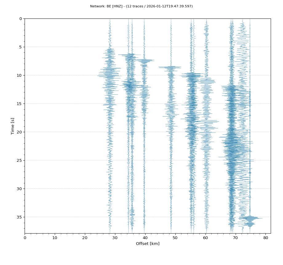 Op de horizontale as is de afstand in km weergegeven en op de vertikale as de tijd in seconden ten opzichte van de tijd van de beving. De data die getoond wordt is gefilterd met een Butterworth filter tussen 2 en 20 Hz. De stations zijn niet op dezelfde manier geschaald.