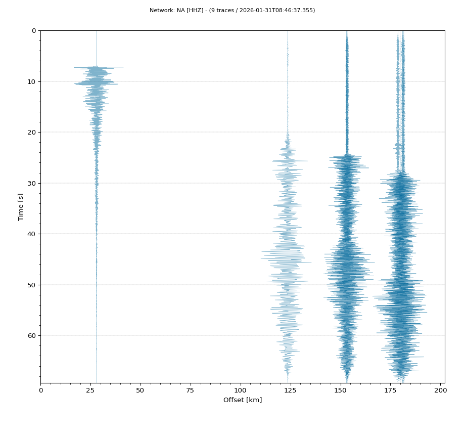 Op de horizontale as is de afstand in km weergegeven en op de vertikale as de tijd in seconden ten opzichte van de tijd van de beving. De data die getoond wordt is gefilterd met een Butterworth filter tussen 2 en 20 Hz. De stations zijn niet op dezelfde manier geschaald.