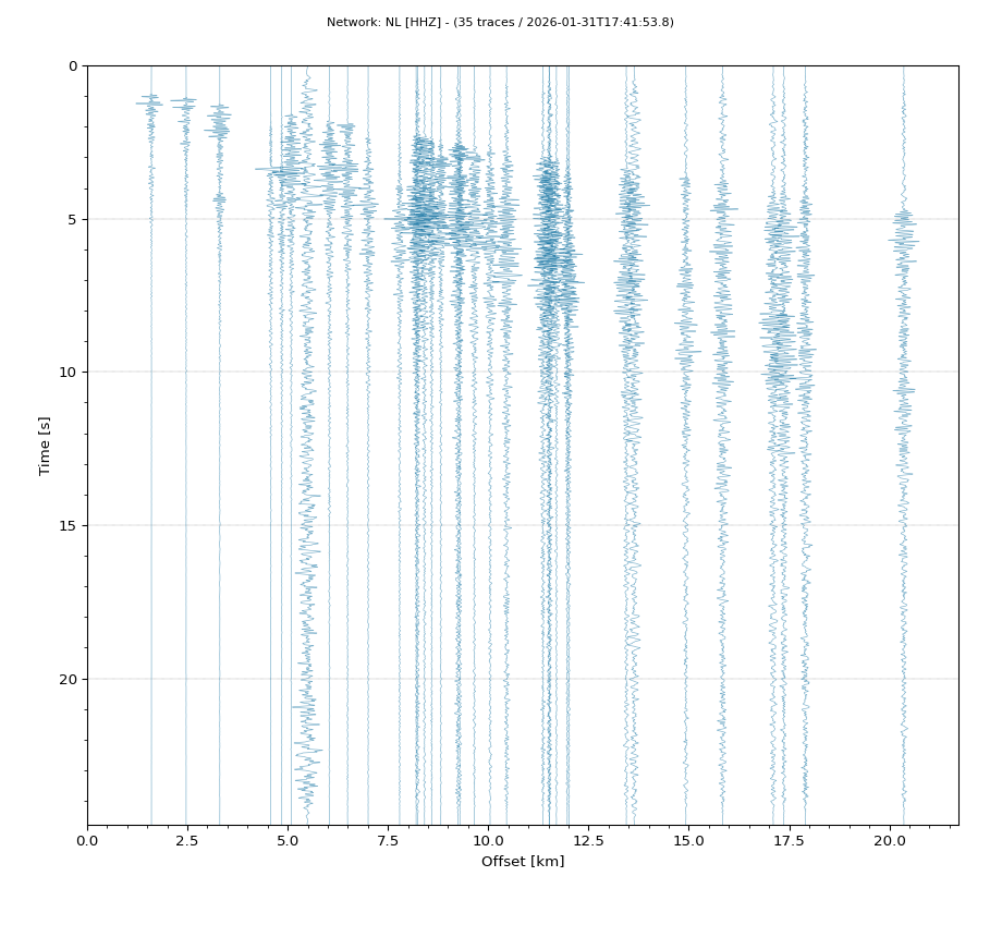 Op de horizontale as is de afstand in km weergegeven en op de vertikale as de tijd in seconden ten opzichte van de tijd van de beving. De data die getoond wordt is gefilterd met een Butterworth filter tussen 2 en 20 Hz. De stations zijn niet op dezelfde manier geschaald.