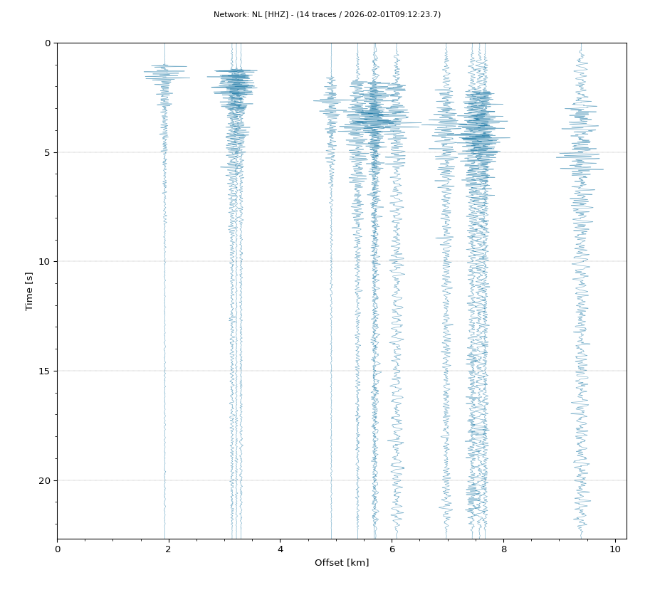 Op de horizontale as is de afstand in km weergegeven en op de vertikale as de tijd in seconden ten opzichte van de tijd van de beving. De data die getoond wordt is gefilterd met een Butterworth filter tussen 2 en 20 Hz. De stations zijn niet op dezelfde manier geschaald.