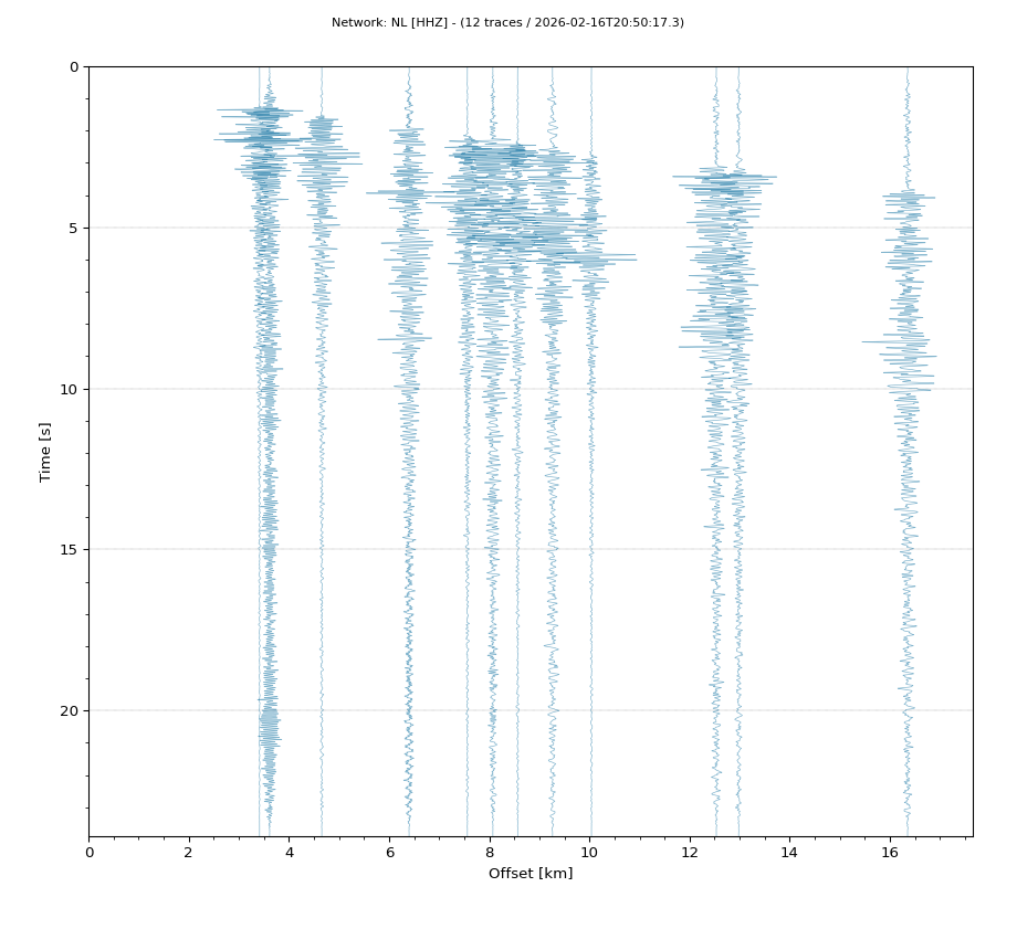 Op de horizontale as is de afstand in km weergegeven en op de vertikale as de tijd in seconden ten opzichte van de tijd van de beving. De data die getoond wordt is gefilterd met een Butterworth filter tussen 2 en 20 Hz. De stations zijn niet op dezelfde manier geschaald.