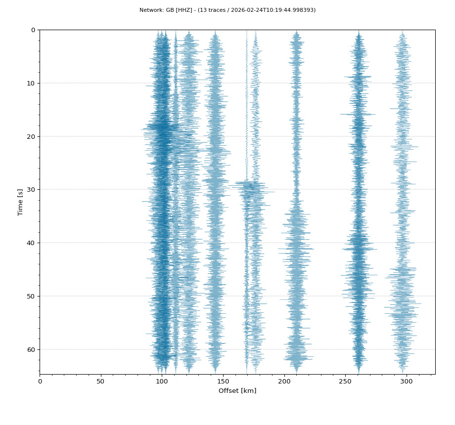 Op de horizontale as is de afstand in km weergegeven en op de vertikale as de tijd in seconden ten opzichte van de tijd van de beving. De data die getoond wordt is gefilterd met een Butterworth filter tussen 2 en 20 Hz. De stations zijn niet op dezelfde manier geschaald.