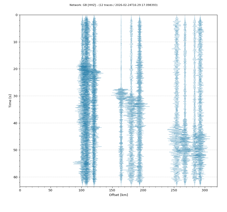 Op de horizontale as is de afstand in km weergegeven en op de vertikale as de tijd in seconden ten opzichte van de tijd van de beving. De data die getoond wordt is gefilterd met een Butterworth filter tussen 2 en 20 Hz. De stations zijn niet op dezelfde manier geschaald.