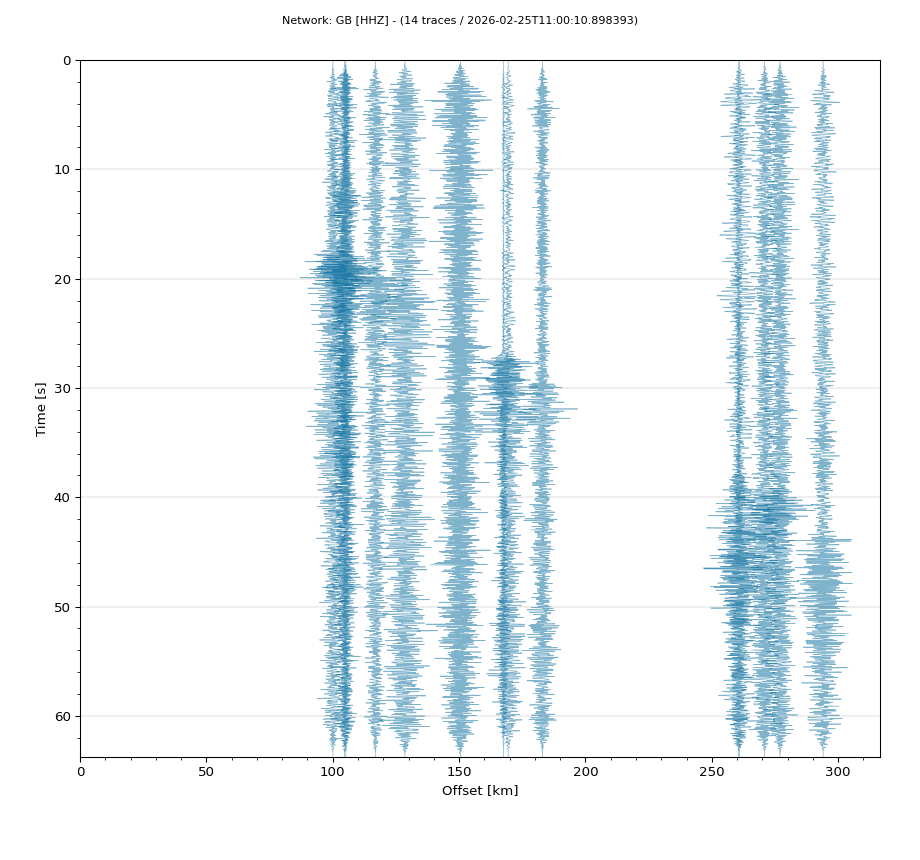 Op de horizontale as is de afstand in km weergegeven en op de vertikale as de tijd in seconden ten opzichte van de tijd van de beving. De data die getoond wordt is gefilterd met een Butterworth filter tussen 2 en 20 Hz. De stations zijn niet op dezelfde manier geschaald.