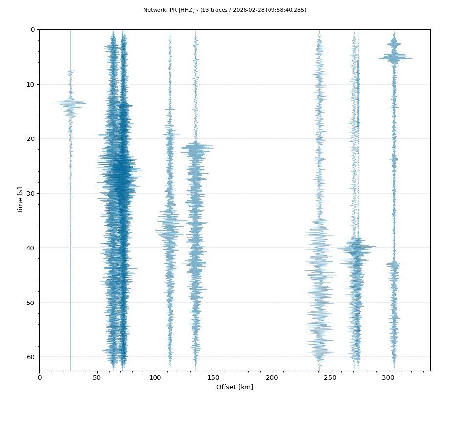 Op de horizontale as is de afstand in km weergegeven en op de vertikale as de tijd in seconden ten opzichte van de tijd van de beving. De data die getoond wordt is gefilterd met een Butterworth filter tussen 2 en 20 Hz. De stations zijn niet op dezelfde manier geschaald.