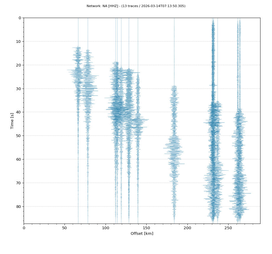 Op de horizontale as is de afstand in km weergegeven en op de vertikale as de tijd in seconden ten opzichte van de tijd van de beving. De data die getoond wordt is gefilterd met een Butterworth filter tussen 2 en 20 Hz. De stations zijn niet op dezelfde manier geschaald.